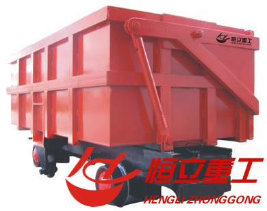 側卸式礦車,是在礦車運行過程中,由卸載輪臂經過卸載曲軌來實現車箱自動傾翻卸料和自動復位。效率高、安全可靠。卸礦是在機車或絞車牽引下,當卸載輪爬上曲軌時,車箱翻轉,車門自動打開實現卸料,車后退曲軌后車箱恢復原位,車門自動鎖固。